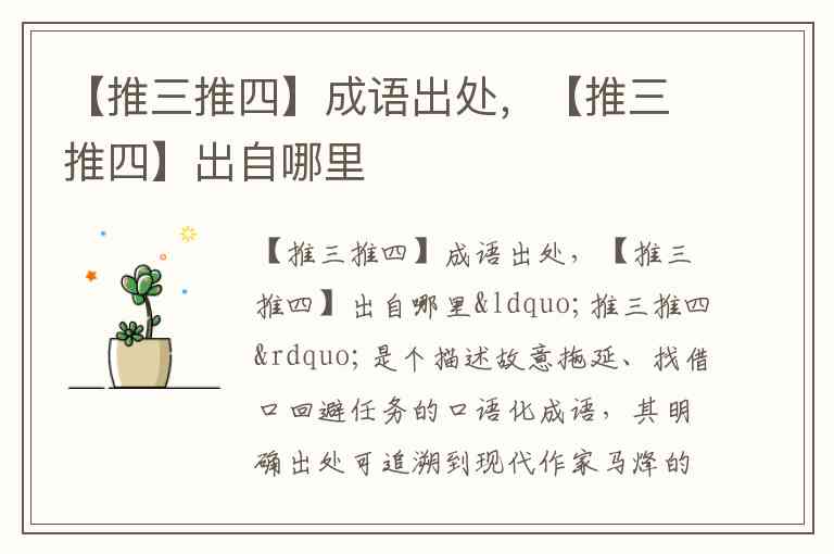 “推三推四”是个描述故意拖延、找借口回避任务的口语化成语,其明确出处可追溯到现代作家马烽的《吕梁英雄传》第27回。书中角色通过对话直斥对方“胆小怕死,还推三推四咧”,用简洁有力的语言刻画了推诿行为。这种表达精准捕捉了人们面对责任时“找第三个理由、第四个借口”的心理状态,与“推三阻四”“百般推辞”等成语形成语义呼应。