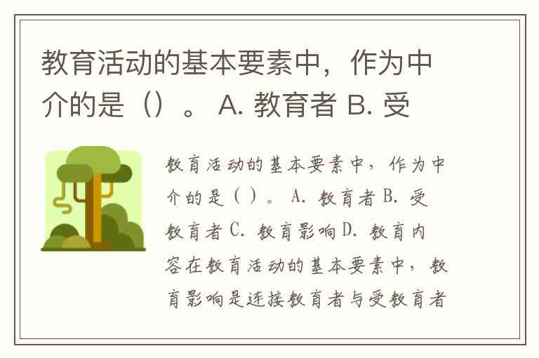教育活动的基本要素中,作为中介的是()。 A. 教育者 B. 受教育者 C. 教育影响 D. 教育内容