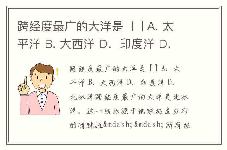 跨经度最广的大洋是 [ ] A. 太平洋 B. 大西洋 D.印度洋 D.北冰洋