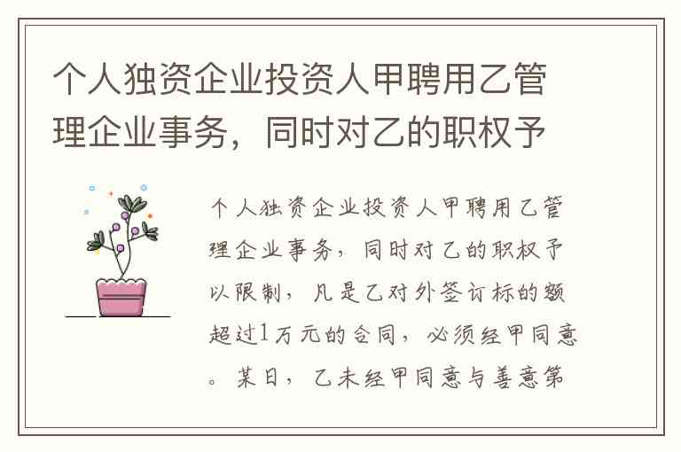 根据《个人独资企业法》核心规则,投资人对受托人职权的限制仅具有内部效力,不得对抗善意第三人。乙作为被聘用的管理人员,其与甲之间关于“签订超过1万元合同须经同意”的职权限制,属于企业内部约定,无法约束不知情的善意相对方丙。这一规则与参考案例中“超过5万元需经同意却签订8万元合同仍有效”的情形完全一致,均体现了法律对交易安全和善意第三人的保护。