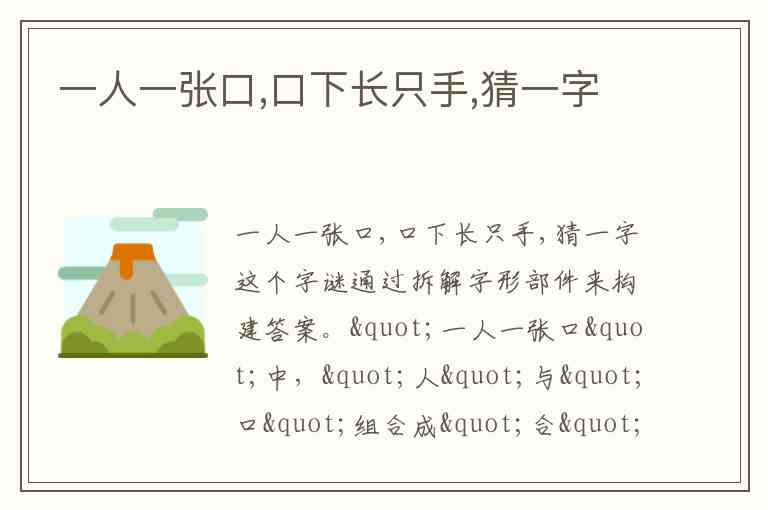 这个字谜通过拆解字形部件来构建答案。"一人一张口"中,"人"与"口"组合成"合";"口下长只手"则提示在"合"字下方添加"手"字。两者叠加后,形成"拿"字——既包含了"人"与"口"的组合,又体现了"手"在下方的位置特征。