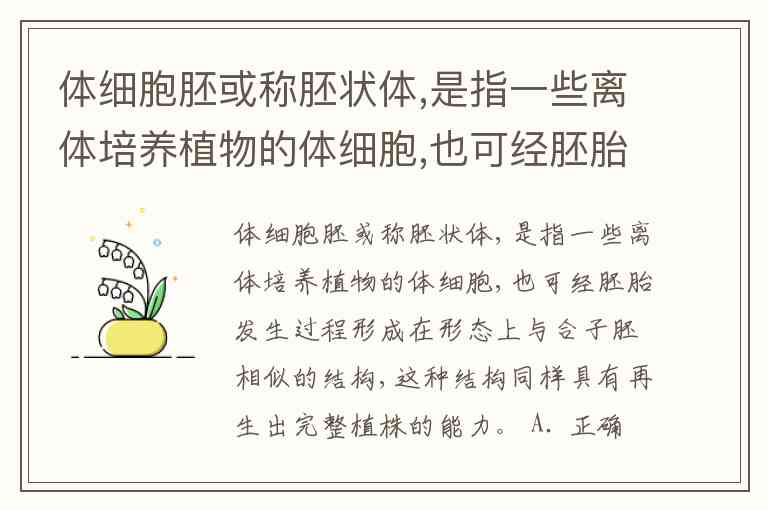 体细胞胚或称胚状体,是指一些离体培养植物的体细胞,也可经胚胎发生过程形成在形态上与合子胚相似的结构,这种结构同样具有再生出完整植株的能力。 A. 正确 B. 错误