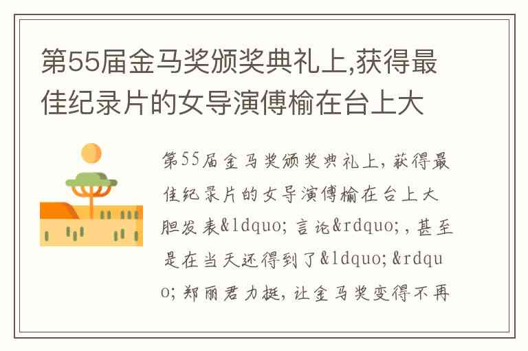 傅榆在第55届金马奖发表的“台独”言论绝非单纯的“言论自由”,而是在华语电影人的共同舞台上公然分裂国家。她声称“希望我们的国家可以被当成一个真正独立的个体来看待”,这番话不仅违背一个中国原则,更得到台当局“文化部长”郑丽君的当场力挺,彻底将艺术场合沦为政治操弄的工具。这种行为并非“艺术表达”,而是对两岸电影人共同珍视的交流平台的破坏——正如影评人史航所言,她“点燃整片森林只为给自己照亮道路”。