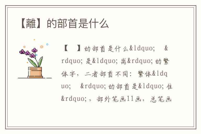 “離”是“离”的繁体字,二者部首不同:繁体“離”的部首是“隹”,部外笔画11画,总笔画19画;简体“离”的部首是“亠”(tóu,俗称“点横头”),部外笔画8画,总笔画10画。