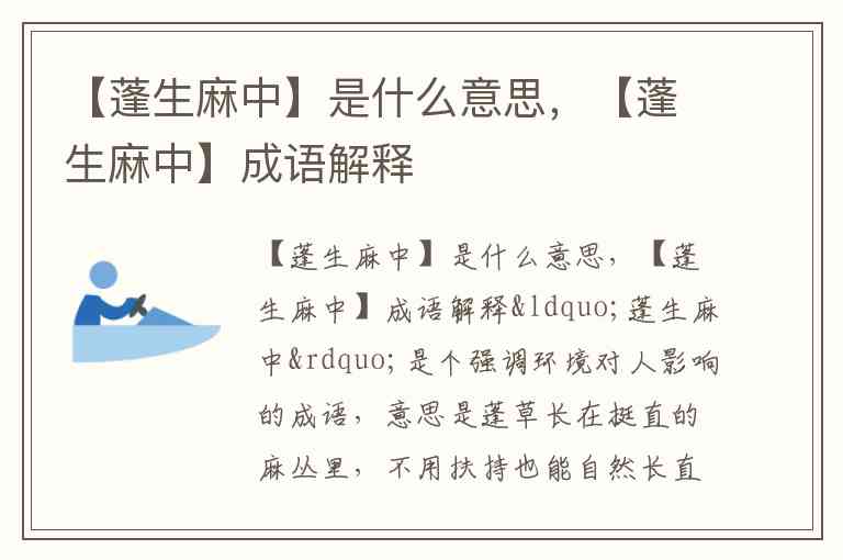 “蓬生麻中”是个强调环境对人影响的成语,意思是蓬草长在挺直的麻丛里,不用扶持也能自然长直,比喻人在好环境中会受积极影响而健康成长。