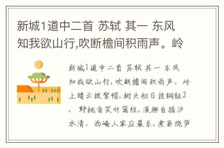 新城1道中二首 苏轼 其一 东风知我欲山行,吹断檐间积雨声。岭上晴云披絮帽,树头初日挂铜钲2。 野桃含笑竹篱短,溪柳自摇沙水清。西崦人家应最乐,煮葵烧笋饷春耕。 下面关于《新城道中》其一分析与归纳,不正确的一项是 A. 首联写诗人正打算去山里,恰好这时雨停,因而说春风极通人性,仿佛特意为之吹断了积雨。这样写,使东风带上了人的感彩,新颖别致,饶有诗意 B. 颔联,描写春天早晨山村晴景。诗人选择了山头、白云、树梢、初升的太阳等四种自然景物来加以描绘,并以“絮帽”与“铜钲”分别比喻“岭”与“树”。 C. 本诗第三、四两句写远景,第五、六两句写近景,意境优美,诗意盎然,散发着浓郁的山野气息,仿佛一组极为美丽的山水画卷,十分真切动人。 D. 尾联由自然景物的描写转入对农人及其生活的反映。雨过天晴,景致优美,令人心旷神怡,西山人家又是煮芹,又是烧笋,忙着给春耕的人们准备食物。