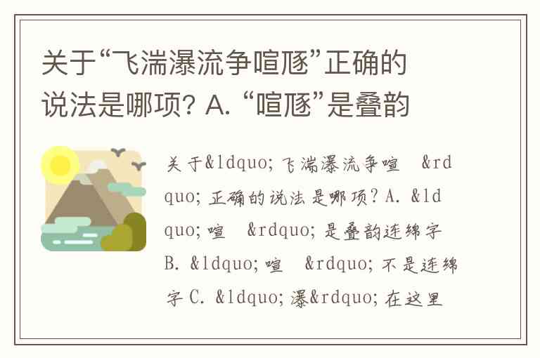 “飞湍瀑流争喧豗”出自李白《蜀道难》,描绘了湍急水流与瀑布在山谷中争相发出轰鸣声的壮阔景象。结合文献分析各选项: