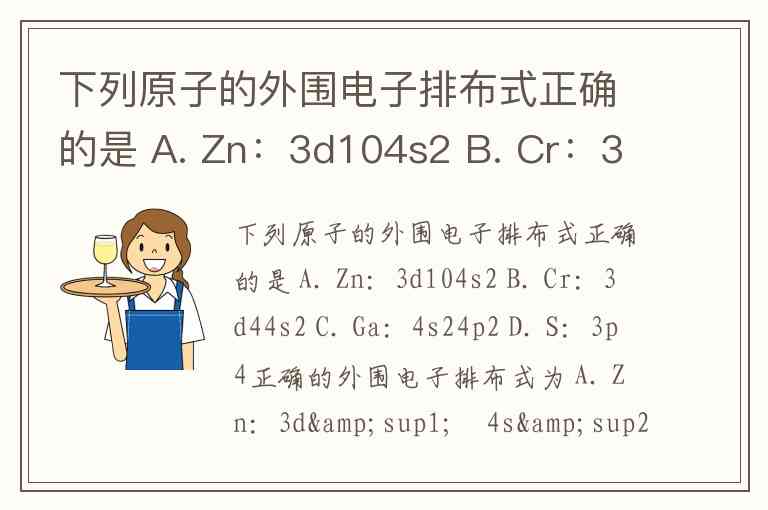 下列原子的外围电子排布式正确的是 A. Zn:3d104s2 B. Cr:3d44s2 C. Ga:4s24p2 D. S:3p4