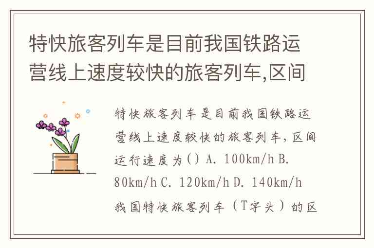 特快旅客列车是目前我国铁路运营线上速度较快的旅客列车,区间运行速度为( ) A. 100km/h B. 80km/h C. 120km/h D. 140km/h
