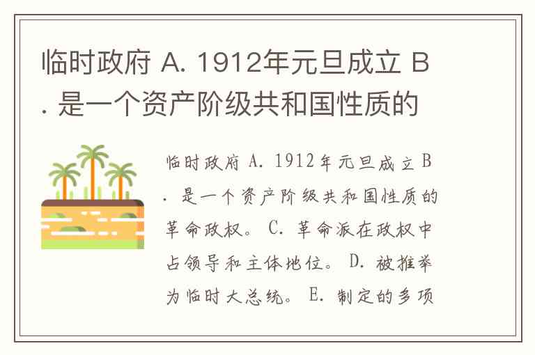 临时政府 A. 1912年元旦成立 B. 是一个资产阶级共和国性质的革命政权。 C. 革命派在政权中占领导和主体地位。 D. 被推举为临时大总统。 E. 制定的多项措施在相当程度上符合广大人民的利益。 F. 具有一定局限性。