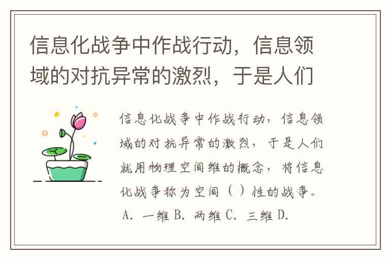 信息化战争中作战行动,信息领域的对抗异常的激烈,于是人们就用物理空间维的概念,将信息化战争称为空间()性的战争。 A. 一维 B. 两维 C. 三维 D. 多维