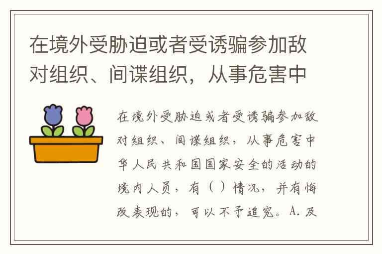 在境外受胁迫或者受诱骗参加敌对组织、间谍组织,从事危害中华人民共和国国家安全的活动的境内人员,有()情况,并有悔改表现的,可以不予追究。A.及时向中华人民共和国驻外机构如实说明。 B.入境后直接及时向国家安全机关、公安机关如实说明。 C.入境后通过所在单位及时向国家安全机关、公安机关如实说明。 D.入境后停止活动,但未向国家安全机关、公安机关如实说明。