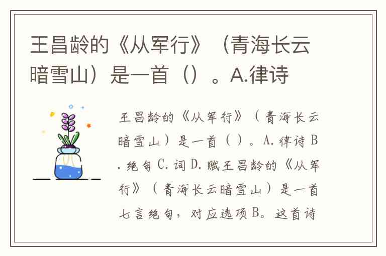 王昌龄的《从军行》(青海长云暗雪山)是一首()。A.律诗 B.绝句 C.词 D.赋