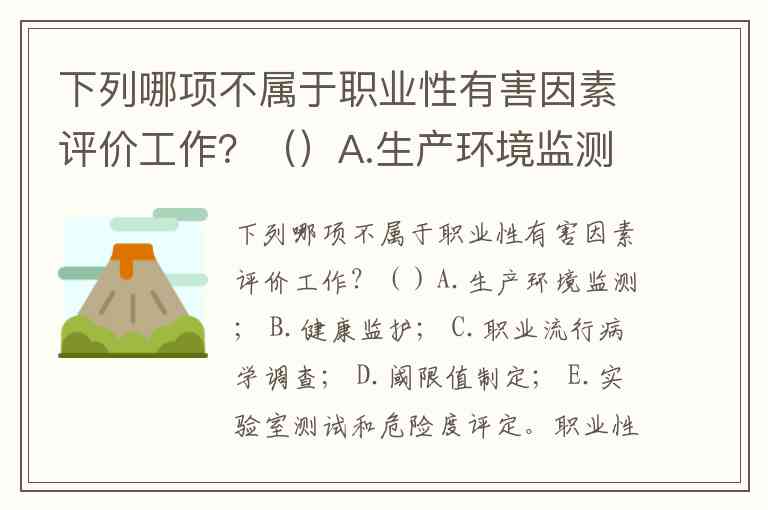 下列哪项不属于职业性有害因素评价工作?()A.生产环境监测; B.健康监护; C.职业流行病学调查; D.阈限值制定; E.实验室测试和危险度评定。