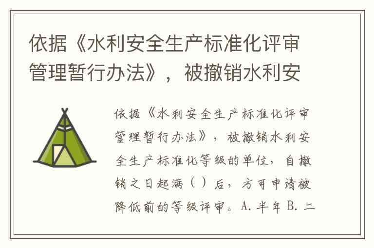 依据《水利安全生产标准化评审管理暂行办法》,被撤销水利安全生产标准化等级的单位,自撤销之日起满()后,方可申请被降低前的等级评审。A.半年 B.二年 C.一年 D.三个月