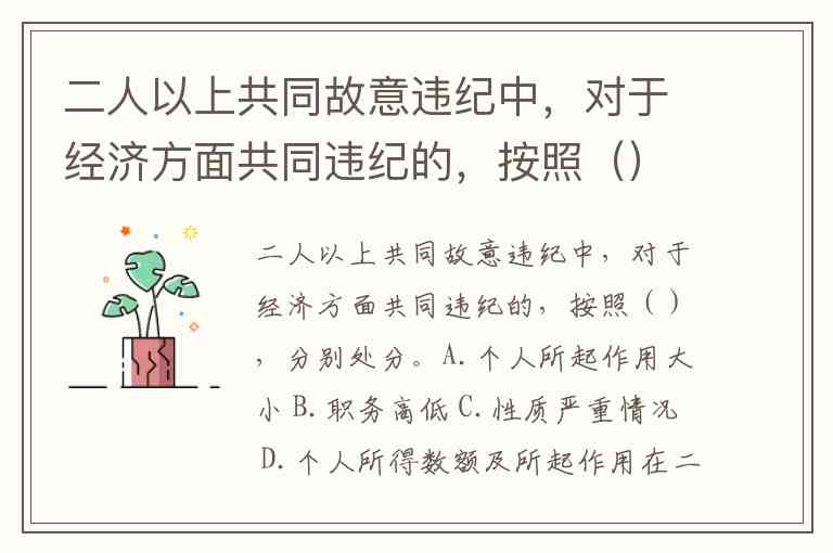 二人以上共同故意违纪中,对于经济方面共同违纪的,按照(),分别处分。A.个人所起作用大小 B.职务高低 C.性质严重情况 D.个人所得数额及所起作用