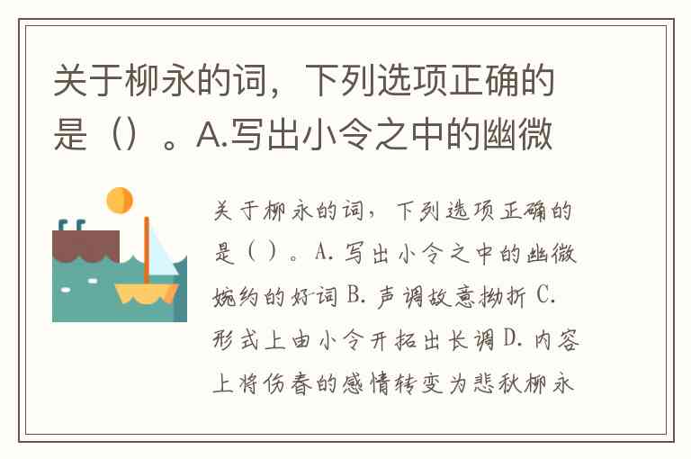 关于柳永的词,下列选项正确的是()。A.写出小令之中的幽微婉约的好词 B.声调故意拗折 C.形式上由小令开拓出长调 D.内容上将伤春的感情转变为悲秋