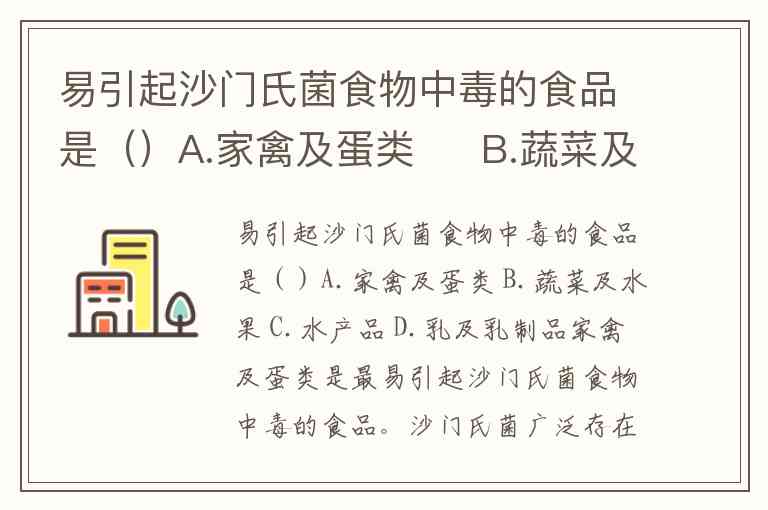 易引起沙门氏菌食物中毒的食品是()A.家禽及蛋类 B.蔬菜及水果 C.水产品 D.乳及乳制品