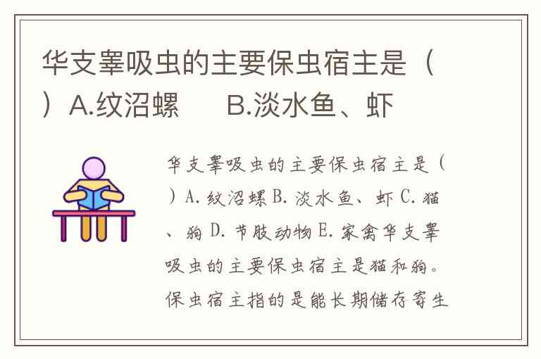 华支睾吸虫的主要保虫宿主是()A.纹沼螺 B.淡水鱼、虾 C.猫、狗 D.节肢动物 E.家禽