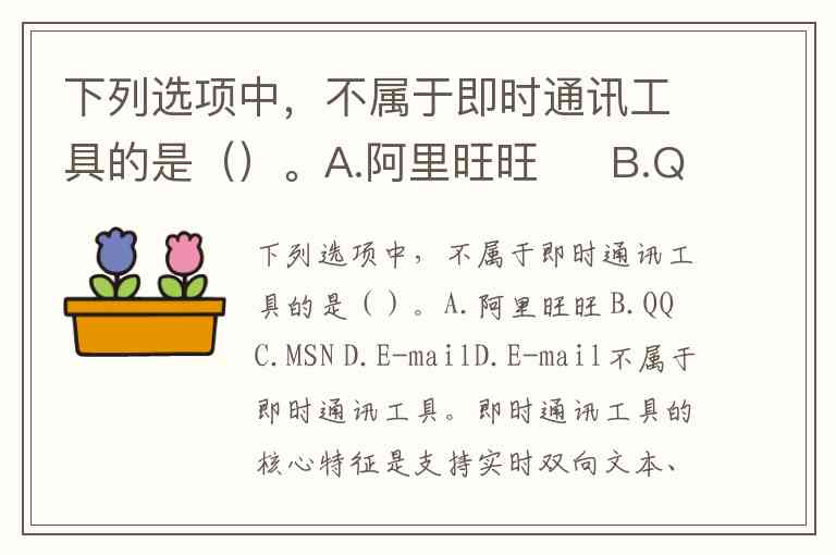 下列选项中,不属于即时通讯工具的是()。A.阿里旺旺 B.QQ C.MSN D.E-mail