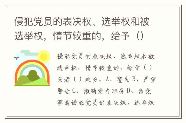 侵犯党员的表决权、选举权和被选举权,情节较重的,给予撤销党内职务或者留党察看处分。这一规定出自《中国共产党纪律处分条例》,该条例明确了对党员纪律处分的种类分为警告、严重警告、撤销党内职务、留党察看和开除党籍五级。其中,撤销党内职务处分适用于需要撤销党员由党内选举或组织任命的职务的情况,而留党察看处分则会导致党员在察看期间丧失表决权、选举权和被选举权,期限通常为一年或二年。