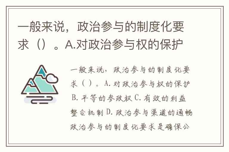 一般来说,政治参与的制度化要求()。A.对政治参与权的保护 B.平等的参政权 C.有效的利益整合机制 D.政治参与渠道的通畅