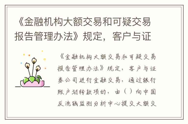 《金融机构大额交易和可疑交易报告管理办法》规定,客户与证券公司进行金融交易,通过银行账户划转款项的,由()向中国反洗钱监测分析中心提交大额交易报告。A、证券公司 B、证券公司和银行各自 C、证券公司和客户各自 D、银行