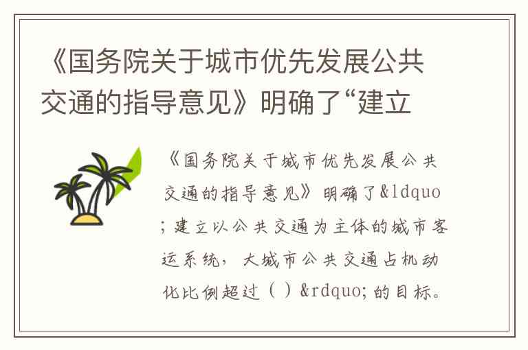 《国务院关于城市优先发展公共交通的指导意见》明确提出,大城市公共交通占机动化出行比例需达到60%左右的目标。这一要求在政策文本中被多次强调,例如在推动以公共汽(电)车为主体的地面公交系统建设时,明确将60%作为大城市公共交通分担率的基准线。