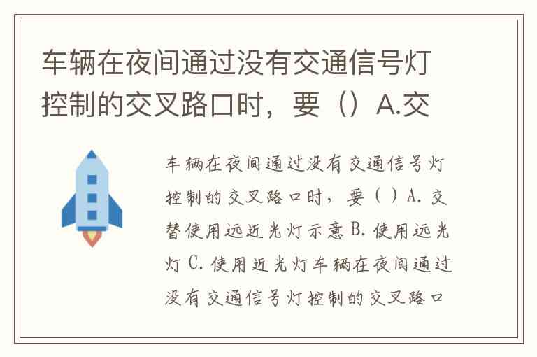 车辆在夜间通过没有交通信号灯控制的交叉路口时,要()A.交替使用远近光灯示意 B.使用远光灯 C.使用近光灯