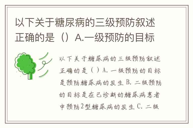 以下关于糖尿病的三级预防叙述正确的是()A.一级预防的目标是预防糖尿病的发生 B.二级预防的目标是在已诊断的糖尿病患者中预防2型糖尿病的发生 C.二级预防的目标是减少已发生的糖尿病并发症的进展降低致残率和死亡率,并改善患者的生存质量 D.三级预防的目标是减少已发生的糖尿病并发症的进展降低致残率和死亡率,并改善患者的生存质量 E.三级预防的目标是已诊断的2型糖尿病患者中预防糖尿病并发症的发生