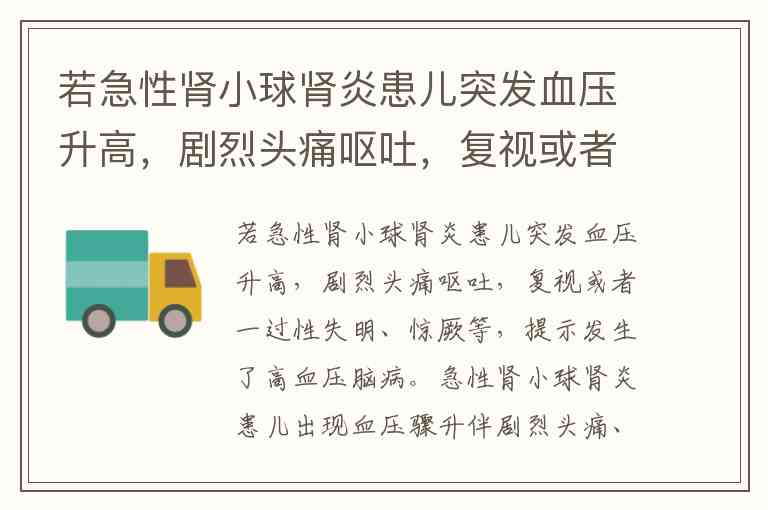 若急性肾小球肾炎患儿突发血压升高,剧烈头痛呕吐,复视或者一过性失明、惊厥等,提示发生了高血压脑病。