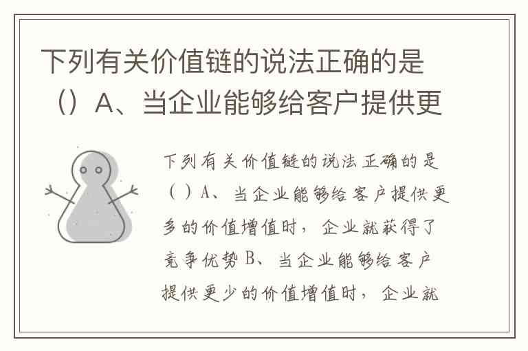 下列有关价值链的说法正确的是()A、当企业能够给客户提供更多的价值增值时,企业就获得了竞争优势 B、当企业能够给客户提供更少的价值增值时,企业就获得了竞争优势 C、当企业能够给以较高的成本提供相同的价值时,企业就获得了竞争优势 D、当企业能够给以较低的成本提供相同的价值时,企业没有获得竞争优势