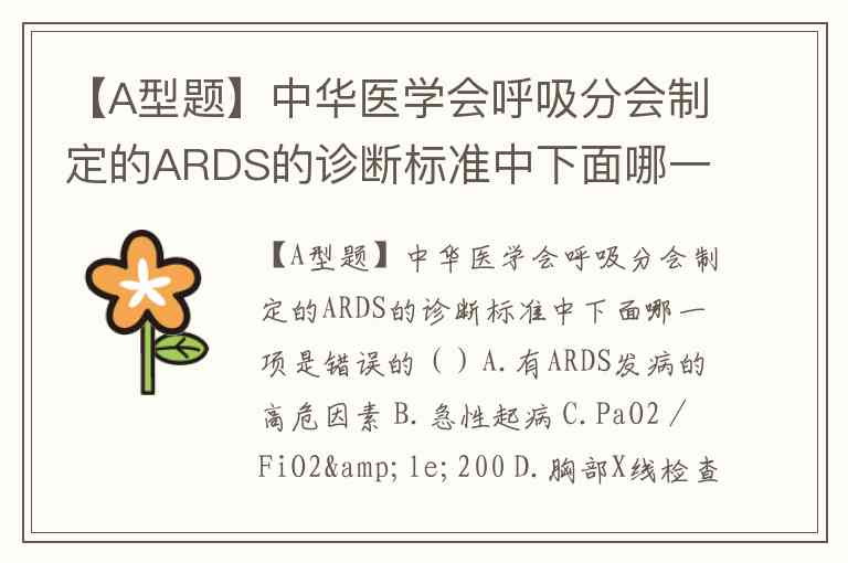 【A型题】中华医学会呼吸分会制定的ARDS的诊断标准中下面哪一项是错误的()A.有ARDS发病的高危因素 B.急性起病 C.PaO2/FiO2≤200 D.胸部X线检查两肺浸润阴影 E.PCWP≤16mmHg