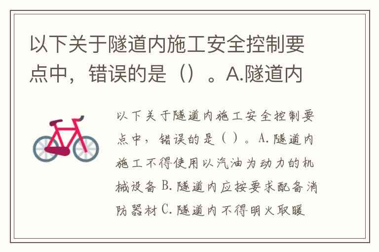 以下关于隧道内施工安全控制要点中,错误的是()。A.隧道内施工不得使用以汽油为动力的机械设备 B.隧道内应按要求配备消防器材 C.隧道内不得明火取暖 D.隧道内存放汽油、柴油、煤油、变压器油、雷管、炸药等易燃易爆物品应采取专门的防火措施