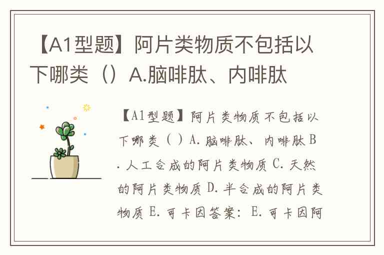 【A1型题】阿片类物质不包括以下哪类()A.脑啡肽、内啡肽 B.人工合成的阿片类物质 C.天然的阿片类物质 D.半合成的阿片类物质 E.可卡因