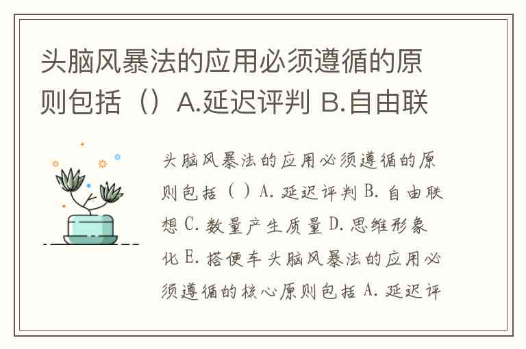 头脑风暴法的应用必须遵循的核心原则包括 A.延迟评判、B.自由联想、C.数量产生质量 和 E.搭便车。这些原则共同构成了激发集体创造力的基础框架,确保参与者在无压力环境中充分释放思维潜能。