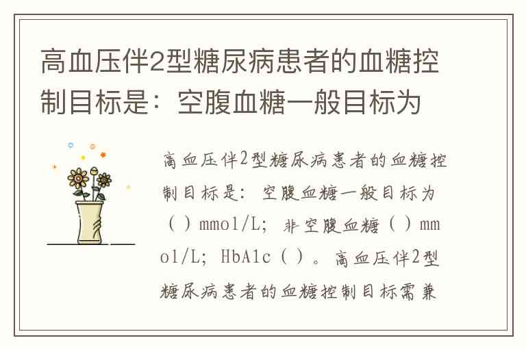 高血压伴2型糖尿病患者的血糖控制目标是:空腹血糖一般目标为()mmol/L;非空腹血糖()mmol/L;HbA1c()。