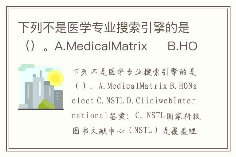 下列不是医学专业搜索引擎的是()。A.MedicalMatrix B.HONselect C.NSTL D.CliniwebInternational