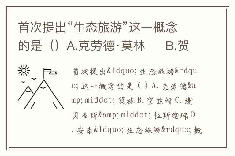 首次提出“生态旅游”这一概念的是()A.克劳德·莫林 B.贺兹特 C.谢贝洛斯·拉斯喀瑞 D.安南