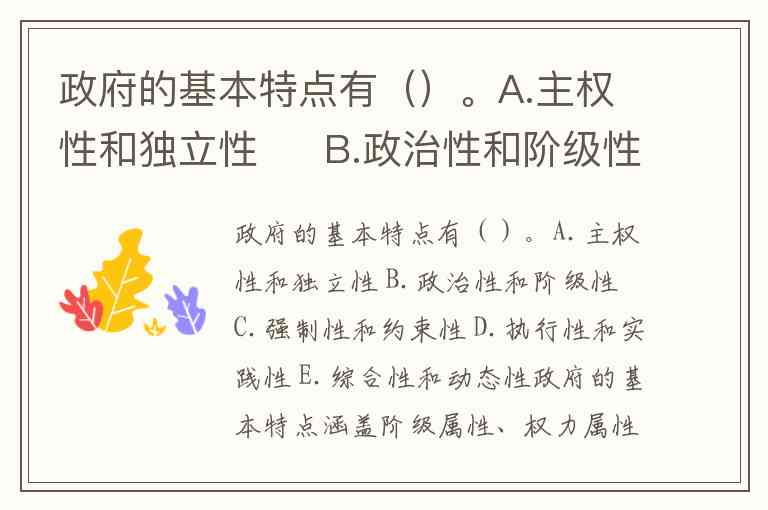 政府的基本特点涵盖阶级属性、权力属性和功能属性三个维度,与题目选项高度契合的包括 A.主权性和独立性、B.政治性和阶级性、C.强制性和约束性、D.执行性和实践性、E.综合性和动态性。这些特征在国家治理中相互交织,共同构成政府运行的核心逻辑。