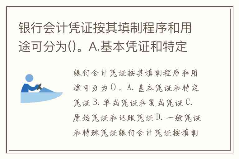 银行会计凭证按其填制程序和用途可分为()。A.基本凭证和特定凭证 B.单式凭证和复式凭证 C.原始凭证和记账凭证 D.一般凭证和特殊凭证