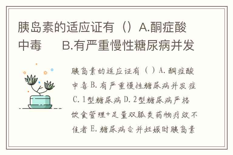胰岛素的适应证有()A.酮症酸中毒 B.有严重慢性糖尿病并发症 C.1型糖尿病 D.2型糖尿病严格饮食管理+足量双胍类药物疗效不佳者 E.糖尿病合并妊娠时