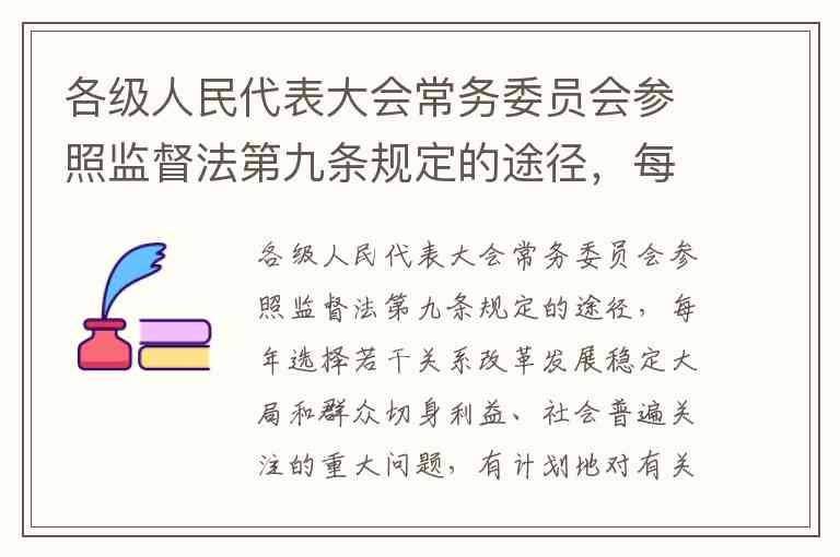 各级人民代表大会常务委员会参照监督法第九条规定的途径,每年选择若干关系改革发展稳定大局和群众切身利益、社会普遍关注的重大问题,有计划地对有关法律、法规实施情况组织()。