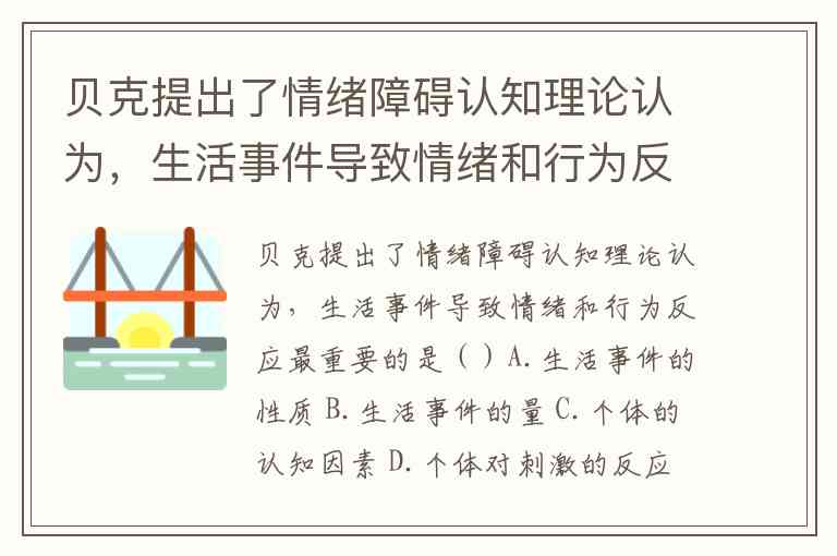 贝克提出了情绪障碍认知理论认为,生活事件导致情绪和行为反应最重要的是()A.生活事件的性质 B.生活事件的量 C.个体的认知因素 D.个体对刺激的反应 E.生活事件的质