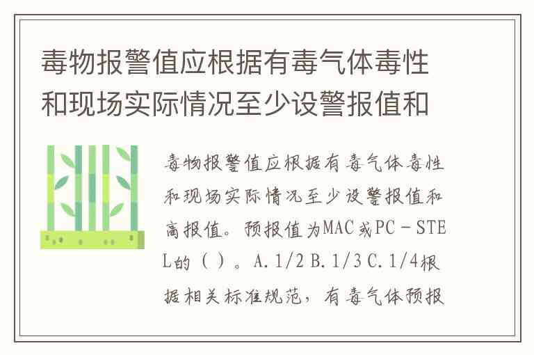 毒物报警值应根据有毒气体毒性和现场实际情况至少设警报值和高报值。预报值为MAC或PC-STEL的()。A.1/2 B.1/3 C.1/4
