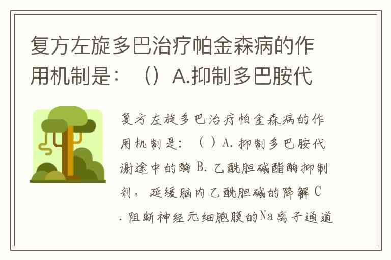 复方左旋多巴治疗帕金森病的作用机制是:()A.抑制多巴胺代谢途中的酶 B.乙酰胆碱酯酶抑制剂,延缓脑内乙酰胆碱的降解 C.阻断神经元细胞膜的Na离子通道 D.增加脑内多巴胺含量