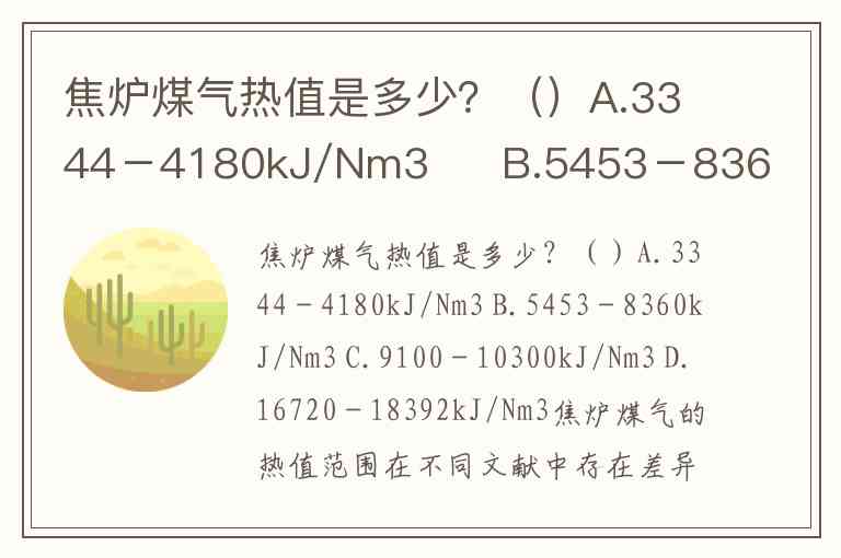 焦炉煤气热值是多少?()A.3344-4180kJ/Nm3 B.5453-8360kJ/Nm3 C.9100-10300kJ/Nm3 D.16720-18392kJ/Nm3