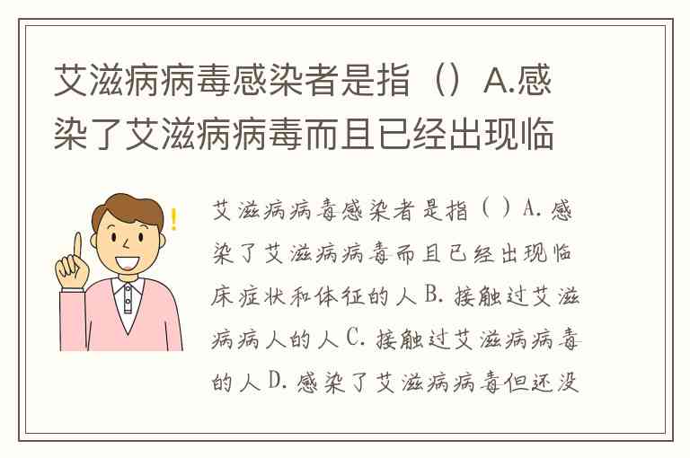 艾滋病病毒感染者是指()A.感染了艾滋病病毒而且已经出现临床症状和体征的人 B.接触过艾滋病病人的人 C.接触过艾滋病病毒的人 D.感染了艾滋病病毒但还没出现临床症状和体征的人