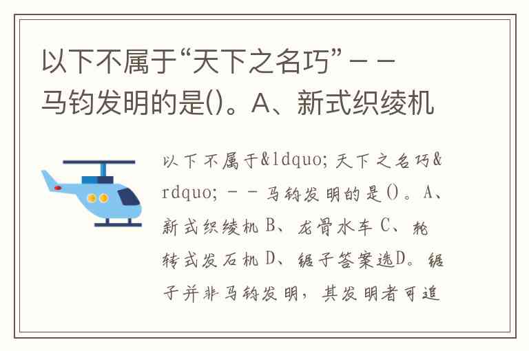 以下不属于“天下之名巧”--马钧发明的是()。A、新式织绫机 B、龙骨水车 C、轮转式发石机 D、锯子