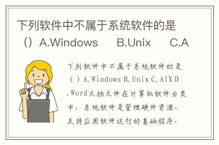 下列软件中不属于系统软件的是()A.Windows B.Unix C.AIX D.Word文档文件